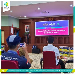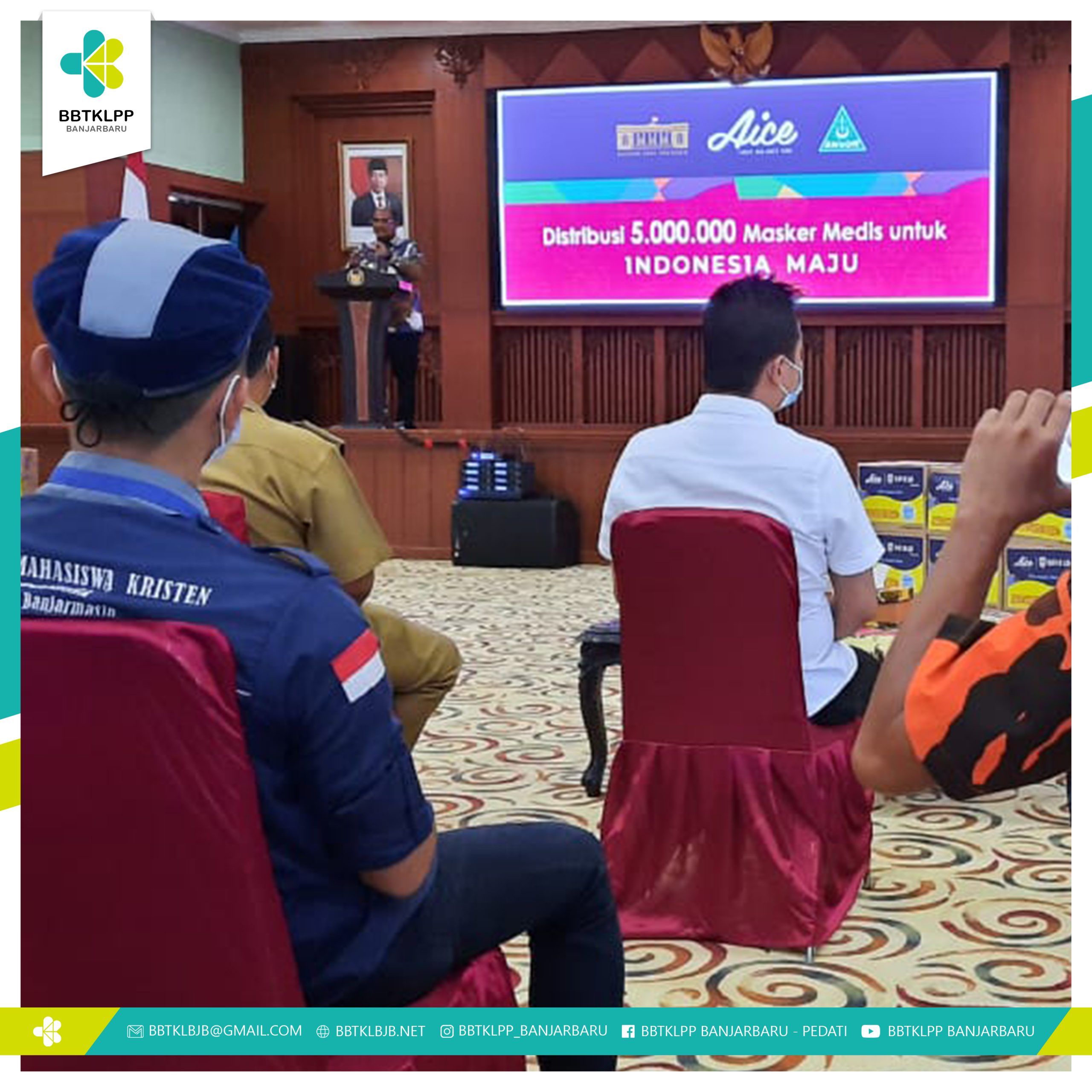 Launching Pembagian 5.000.000 (Lima Juta) Masker Medis untuk Indonesia Maju yang dilaksanakan oleh Pemerintah (Kantor Staf Presiden), Sektor Usaha (Aice Group) dan Kelompok Masyarakat (Gerakan Pemuda Ansor) untuk Kalimantan Selatan dilaksanakan hari ini (08/03). Kegiatan berlangsung di Gedung Dr. KH. Idham Chalid dengan agenda pembagian masker medis secara simbolis kepada Gubernur Kalimantan Selatan dengan jumlah masker yang akan didistribusikan sebanyak 150.000 (seratus lima puluh ribu).