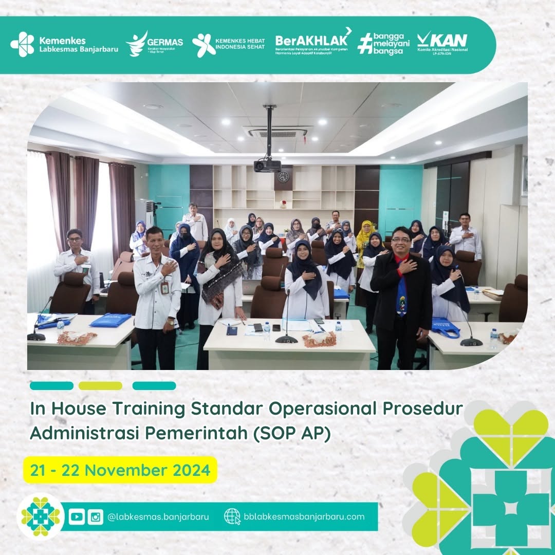 Balai Besar Labkesmas Banjarbaru Mengadakan Kegiatan In House Training Standar Operasional Prosedur Administrasi Pemerintah (SOP AP) pada 21-22 November 2024 di Balai Besar Labkesmas Banjarbaru bersama narasumber Kunto Wibisono, SE, CHRA., CP.NLP