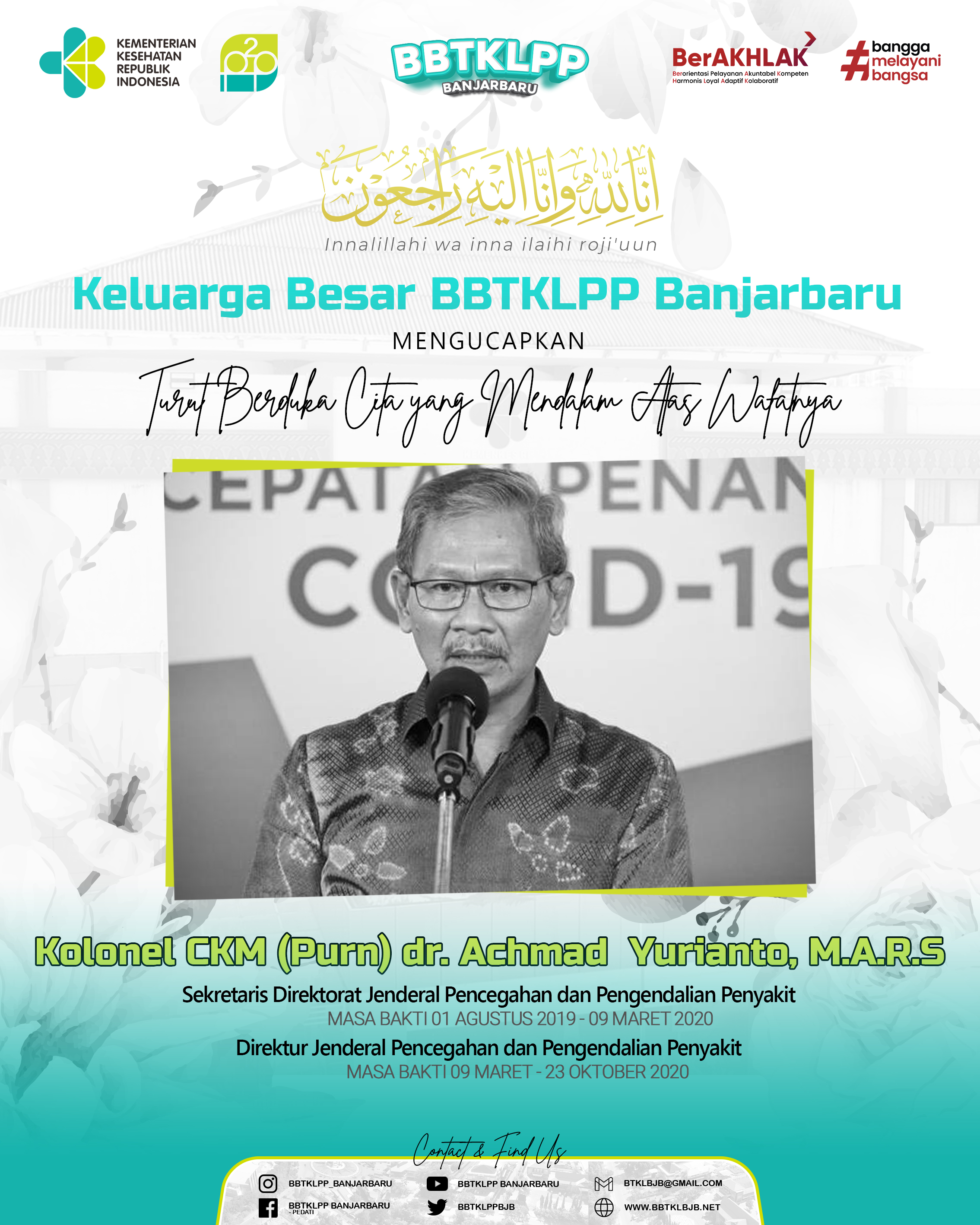 Innalillahi wa inna ilaihi raji’un Keluarga Besar BBTKLPP Banjarbaru Mengucapkan Turut berduka cita yang mendalam atas wafatnya Kolonel CKM (Purn) dr. Achmad Yurianto, M.A.R.S pada Sabtu, 21 Mei 2022 diBACA SELANJUTNYA